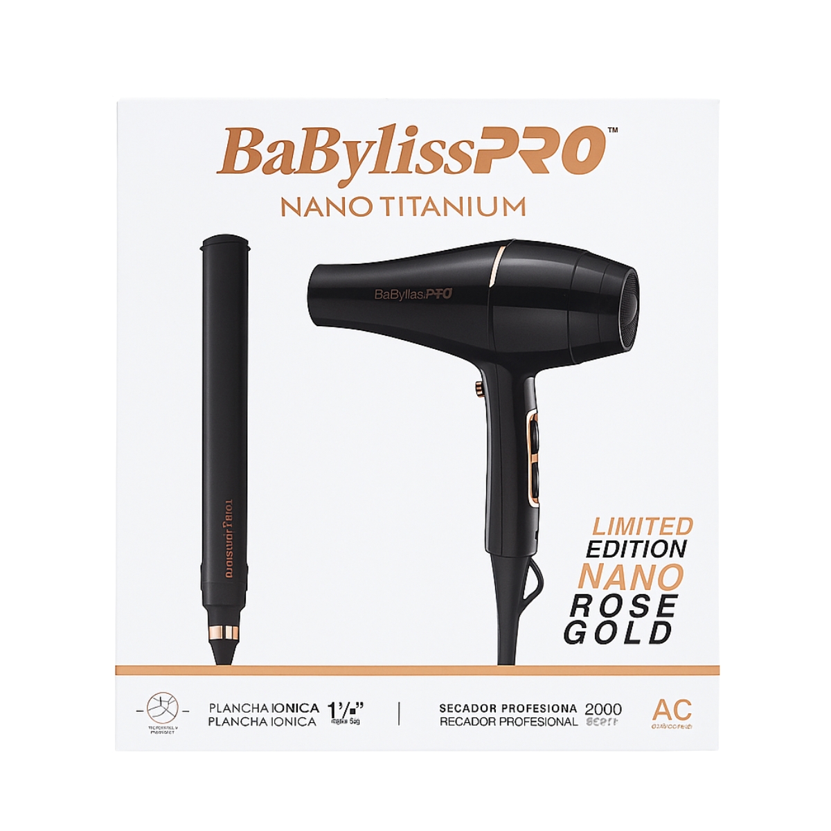 El Combo BaBylissPRO Nano Titanium Rose Gold BNTRGPP43SR incluye un secador de 2000 W y una plancha de 1¼» con tecnología Nano Titanium que brindan potencia, protección y estilo profesional desde casa.